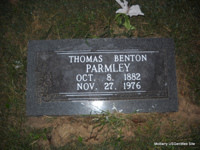 | PARMLEY, Thomas Benton | Oct. 8, 1882 | Nov. 27, 1976 | Research Note: Son of William H. Parmley and Louisa Bridges. - 1900 Census, Newtonia, Newton, Missouri - William H. Parmley, head, age 55, born IL, married 33 years, father born IL, mother KY, farmer; Louisa, wife, married 33 years, born IL, mother of 8 children, 7 living, father born KY, mother PA; John G., son, born Nov. 1874 IL, age 25, single; Thomas B., son, born Oct. 1882 MO, age 17, single. - T. B. Parmley married Miss Nellie Henry on Aug. 10, 1903 in Newton Co., MO. W. H. Parmley and Alma Henry were witnesses to the marriage. SSDI gives Nellie's death as Mar. 1964 in MO. T. B. Parmley, age 63, of Neosho, Newton Co., MO, married Drusilla Meritt age 54, of Locust Grove, Mayes Co., OK, on Feb. 12, 1946 in Washington Co., AR. SSDI gives Thomas' last residence as Locust Grove, Mayes Co., OK. Nellie is buried at Clear Creek Cemetery, Newton Co., MO. | Census SSDI Phyllis Long Photo Donna Cooper Ted Roller |