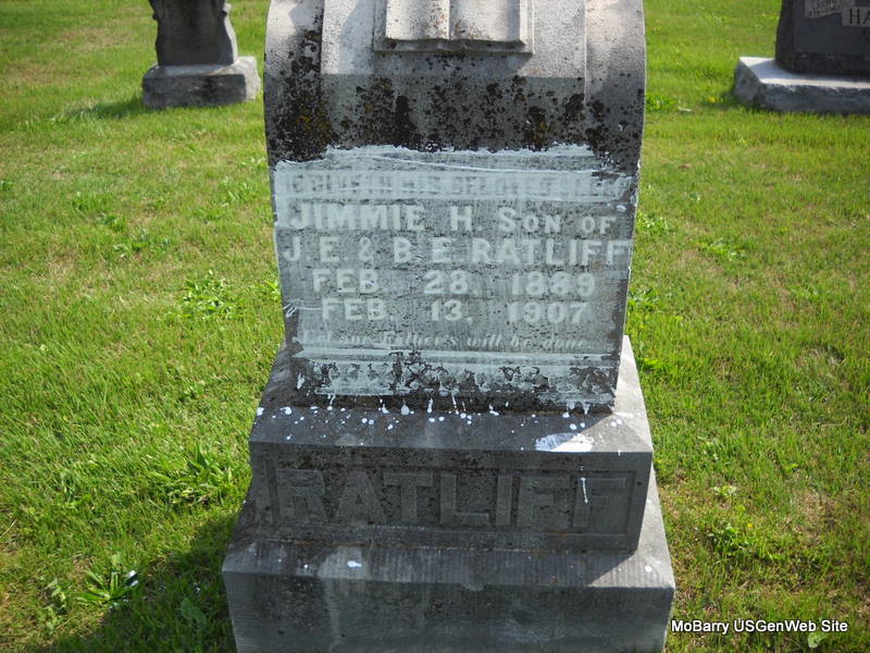 Inscription: "Son of J. E. & B. E." - Research Note: Newton Co. News, Feb. 28, 1907 - Died of pneumonia fever, at his home three miles east of Newtonia, on February 13, 1907, James Henry Ratliff, aged 17 yrs. 11 mo and 15 days. The deceased was a son of the late Job Ratliff. His mother Bertha Ratliff survives him also two sisters and four brothers. Jim as he was known by his friends, was an excellent boy who never had an enemy and who had a host of friends; always obedient to his parents and a kind loving brother to his sisters and brothers. His father preceded him to the spirit land just nine days before. He died of the same fever. One great consolation to the heart broken mother is that her boy was prepared to meet his Saviour and his dear father. Just a little while before his death he said, "Jesus has saved me and he has come for me," and we feel that his goodbye to his father was only for a short time and was followed by a happy reunion in Heaven. Jesus alone can comfort the sorrowing family and may his tender love and sympathy make smoother life's pathway for them until they shall all meet again in the land where troubles are never known. | Newton Co. News Phyllis Long Photo Donna Cooper Ted Roller |