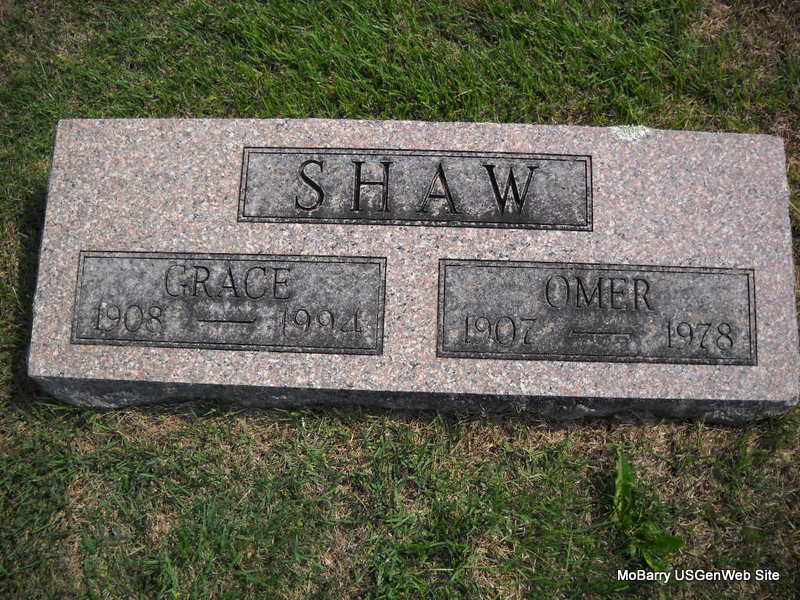 SSW: Grace - Research Note: SSDI gives his last residence as Kansas City, Jackson Co., MO. - 1920 Census, Pierce City, Lawrence, Missouri - Mary Shaw, head, age 34, widowed, born MO, parents born MO, seamstress; Omer, son, age 13, son, born MO, parents born MO. | SSDI Census Phyllis Long Photo Donna Cooper Ted Roller |