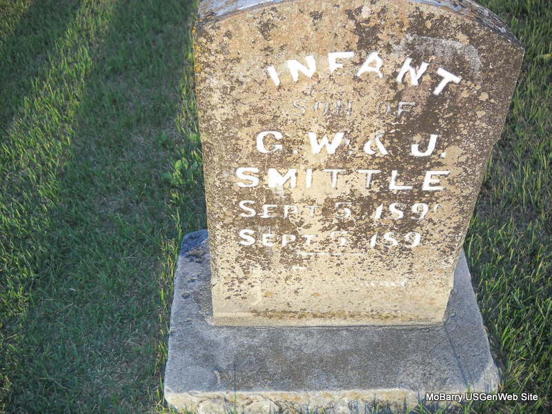 | SMITTLE, Infant | Sept. 5, 1899 | Sept. 5, 1899 | Inscription: "Son of G. W. & J." - Research Note: Son of George Washington Smittle and Martha Jane West, both buried at Park Cemetery, Columbus, KS. Martha was the daughter of Joseph Franklin West and Rhoda Lucinda Kelly, both buried at Bethel Jolly Cemetery. | Note Phyllis Long Photo Donna Cooper Ted Roller |