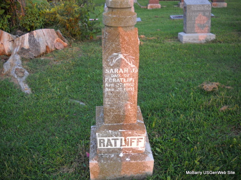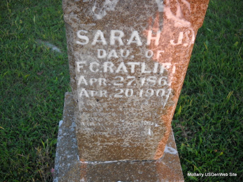 | RATLIFF, Sarah J. | Apr. 27, 1863 | Apr. 20, 1901 | SSW: F. C. - Inscription: "Dau. of F. C. Ratliff" - Research Note: Daughter of Job Ratliff and Feriba Barker. Born after her father's death. - Another Photo | Note Phyllis Long Photos Donna Cooper Ted Roller |