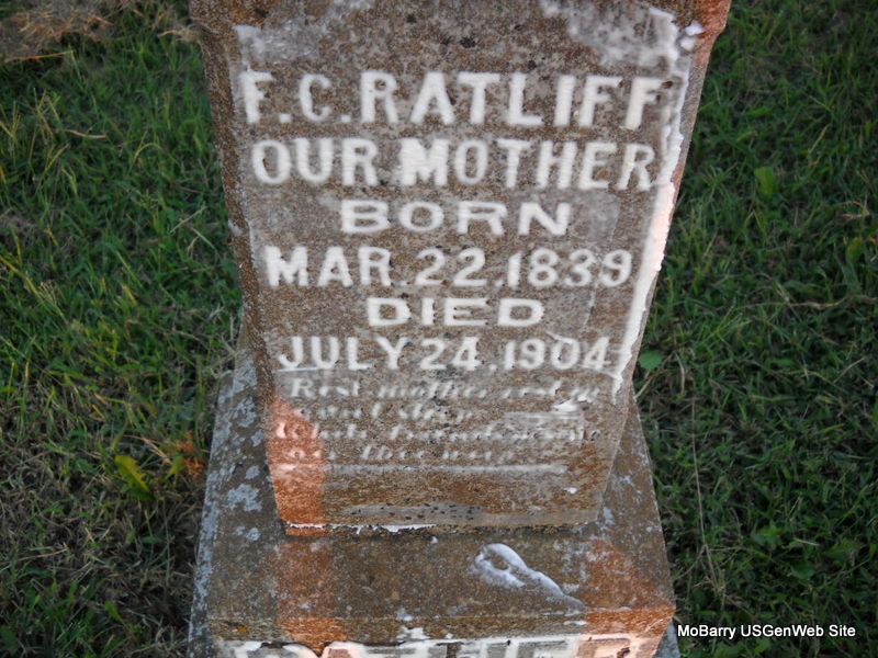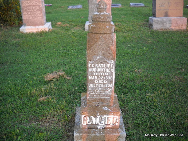 | RATLIFF, Feriba C. (BARKER) | Mar. 22, 1839 | July 24, 1904 | SSW: Sarah J. - Inscription: "Our Mother" - Research Note: Wife of James Polk Ratliff, married on Mar. 1, 1855. James was a Civil War Veteran with Captain James Richey, 76th Reg., enrolled militia of MO. He died in his father's home on Feb. 3, 1863. Daughter of George F. Barker and Leah Ward. - Newton County Probate Court (In vacation) 7th April 1854 - Now at this day comes Miss Feriby Barker a minor heir at law of George Barker decd. over fourteen years of age, and made choice of James H. Christian, as guardian of this person and curator of her Estate; and the aforesaid James H. Christian having this day presented to the Judge of the Probate court, a bond executed by said Christian payable to the state of Missouri, to the use and benefit of Feriby Barker in the sum of Four Thousand dollars with Hugh C. Armstrong and Horace W. Long as securities, said bond is received approved and filed and the court considering said James H. Christian a suitable person to act as such guardian and curator; have this day appointed him the said James H. Christian as such guardian and curator of said ward, he the aforesaid James H. Christian having Generally complied with the laws of Missouri, in such cases made and provided. This 7th day of April 1854. Robt. Brock, Judge of Probate - George Barker died in 1847 and Leah died in 1842. - Another Photo | Census Newton Co. History Barker Family Bible Phyllis Long Photos Donna Cooper Ted Roller |