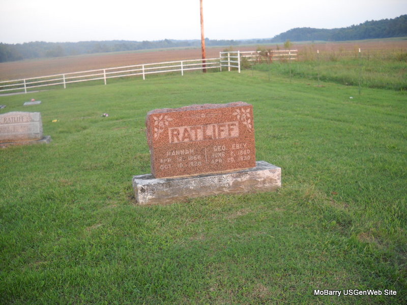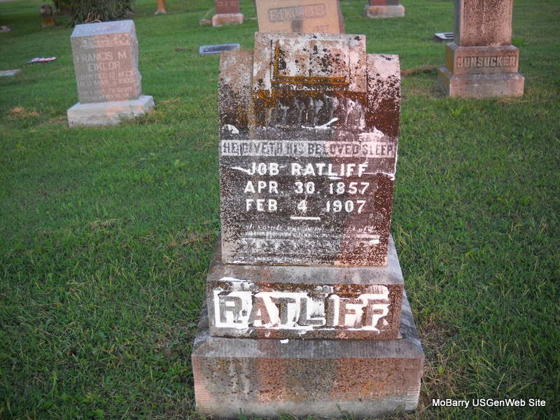 Research Note: He is buried next to F. C. Ratliff, his mother. His wife was Bertha Payne. Bertha Payne married Job Ratliff on Feb. 2, 1888 in Newton Co., MO. Son of James Polk and Feriby (Barker) Ratliff. - Newton Co. News - On Monday February 4th the death angel visited the home of Bro. Job Ratliff and claimed him for one of its number. He suffered an illness of several days. His suffering though made greater by the union of the two dread fevers, pneumonia and typhoid was shortened; on the morning of his death he asked for Christians to sing and pray with him. Though he did not say in words, by actions which speak louder than words he said, "Let me die the death of the righteous." Bro. Ratliff was 49 years 11 months old. Remains were interred at Jolly cemetery Feb. 5. | Newton Co. News MO Marriage Records Census Phyllis Long Photo Donna Cooper Ted Roller |