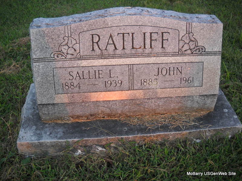 SSW: John - Research Note: Her death certificate reads that Callaway was the funeral home. Her husband was John Ratliff. She was a daughter of Bogle Thompson, born TN and Nancy Pulley, born Pettis Co., MO. Mrs. L. C. Putman of Stark City, MO was the informant. - John Ratliff married Sallie L. Thompson on Nov. 26, 1905 in Newton Co., MO. | Death Certificate MO Marriage Records Phyllis Long Photo Donna Cooper Ted Roller |