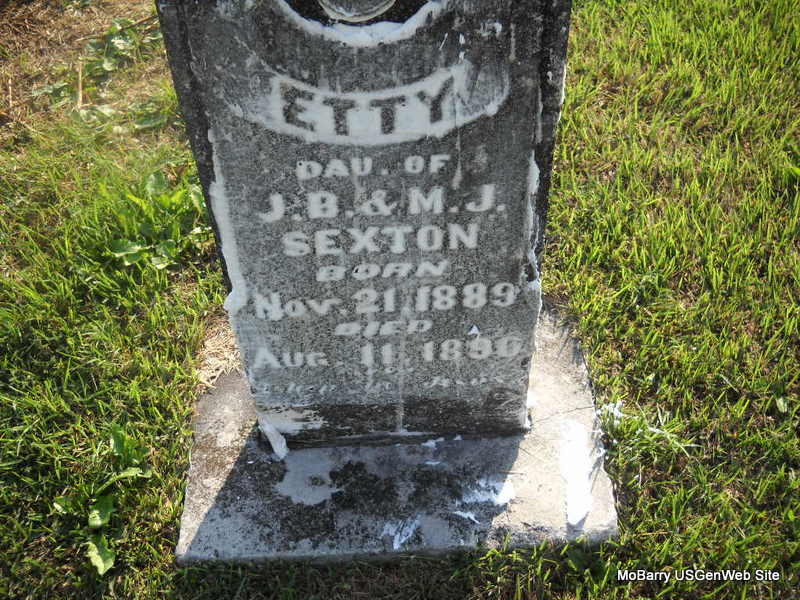 | SEXTON, Etty | Nov. 21, 1889 | Apr. 11, 1890 | Inscription: "Dau. of J. B. & M. J." - Research Note: Has to be the daughter of John B. and Martha J. (Simmons) Sexton. - 1900 Census, Capps Creek, Barry, Missouri - John B. Sexton, head, born May 1853 MO, age 47, married 17 years, father born IN, mother TN, farmer; Martha J., wife, born Sept. 1860 MO, age 39 married 17 years, mother of 6 children, 4 living, father born IN, mother MO; James, son, born Nov. 1883 MO, age 16; Emma C., daughter, born July 1885 MO, age 14; Levi, son, born Jan. 1887 MO, age 13; Elzy, son, born Nov. 1892 MO, age 7. - John B. Sexton married Martha J. Simmons on Jan. 28, 1883 in Barry Co., MO. - Another Photo | Census MO Marriage Records Phyllis Long Photos Donna Cooper Ted Roller |