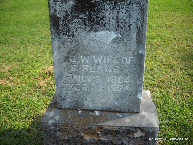 Inscription: "Wife of S. Slane" - Research Note: Daughter of Pleasant William Ross, born Newton Co., MO. Mother not named on the death certificate. William Cowan of Pierce City, MO was the informant. Her mother was Evia Calbert. - Jane Ross married James E. LeGrand on Feb. 11, 1993 in Barry Co., MO. He died in 1892 and is buried at Bethel Jolly Cemetery. - 1900 Census, Newtonia, Newton, Missouri - Jane is living with her mother-in-law, Rachel, and children Dora, age 14, DeWitt, age 12, and Miner C., age 10. - 1910 Census, Berwick, Newton, Missouri - Jane is married to Simon Slane. | Death Certificate Census Phyllis Long Photo Donna Cooper Ted Roller |