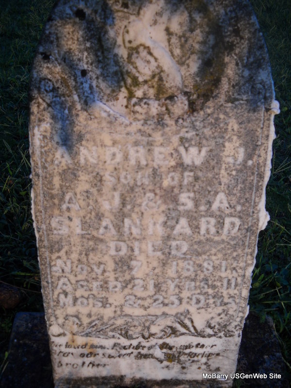 Inscription: "Son of A. J. & S. A. Slankard - Aged 21 Yrs. 11 Mos. & 25 Dys." - Research Note: Son of Andrew Jackson Slankard and Sarah Ann Bridges. | Census Phyllis Long Photo Donna Cooper Ted Roller |