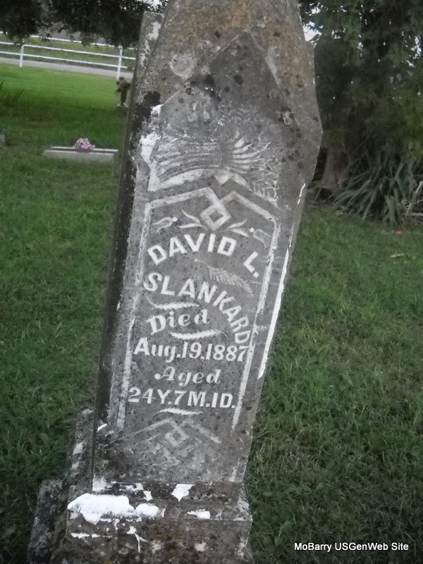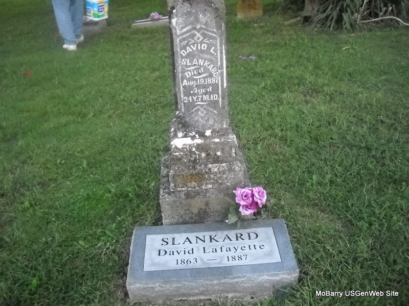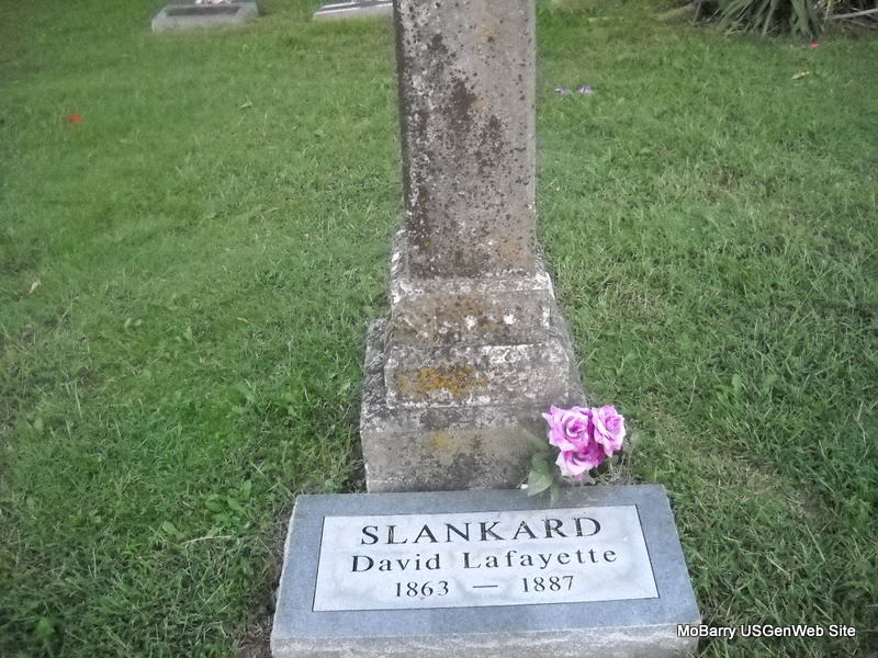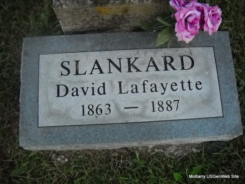 Inscription: "Aged 24 Y. 7 M. 1 D." - Research Note: Son of George Franklin Slankard and Katherine Hoover. Records at findagrave.com have his wife as Augusta Virginia (Hightower) (Slankard) (Jones) Puterbaugh. On March 8, 1887, she married David Lafayette Slankard, circa 1889, she married Phil Jones, and on December 24, 1901, she married C. S. Puterbaugh. Buried Forest Park Cemetery, Joplin, MO. - Another Photo - Another Photo - Another Photo | Census Note Phyllis Long Photos Donna Cooper Ted Roller |
