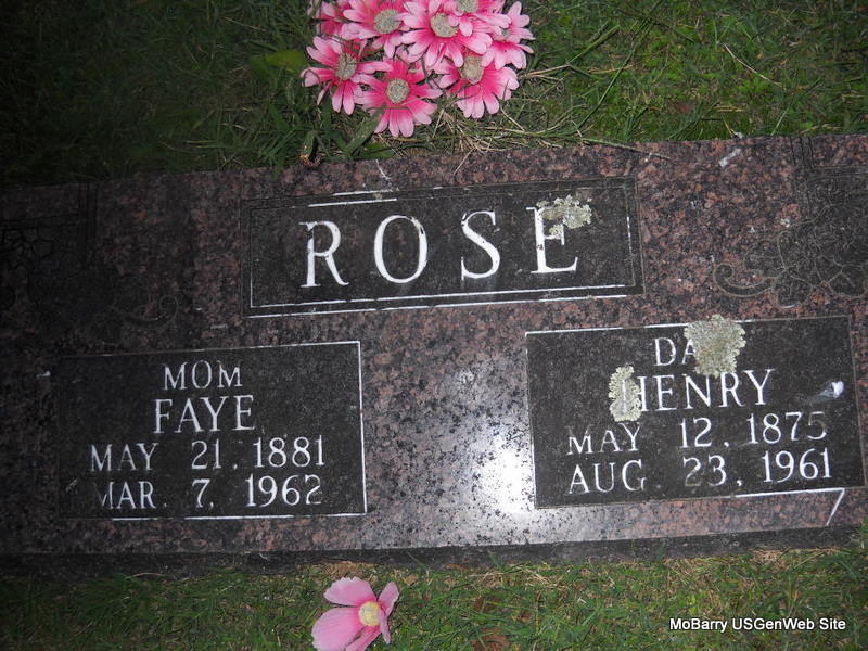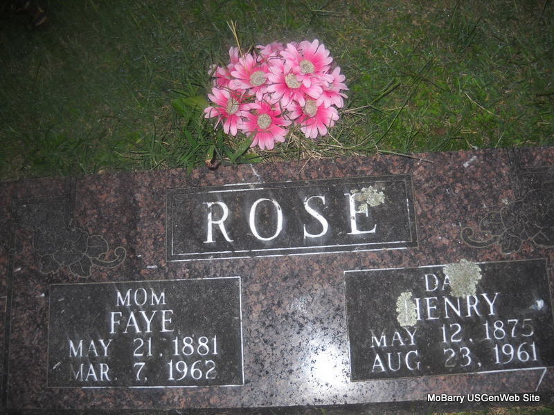 SSW: Faye - Research Note: Son of Henry Rose and Harriet Groff. His wife, Faye Rose, was the informant on the death certificate. - 1880 Census, MT Vernon, Lawrence, Missouri - Henry Rose, age 50, farmer, born Germany; Harriet, age 38, wife, born PA, parents born NY; Albert, son, age 12, born PA; William, son, age 8, born PA; Sophia, daughter, age 6, born PA; Henry, son, age 4, born PA. - 1930 Census, Capps Creek, Barry, Missouri - Henry Rose, head, age 54, married at age 26, born PA, father born PA (should be Germany), mother born MI, farmer; Fay, wife, age 48, married at age 20, born IA, father born IL, mother MA; Louise, daughter, age 11, born MO; Mary Bourland, mother-in-law, age 88, widowed, married at age 18, born MA, parents born MA. | Death Certificate Census Phyllis Long Photo Donna Cooper Ted Roller |