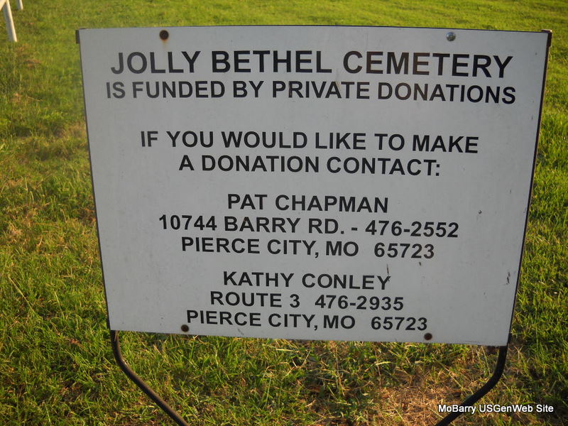 Directions: From the intersection of hwy. 60 and 37 in Monett, MO: Go about 6 miles west on 60 hwy, watch for a sign on the hwy. that reads Jolly Mill, with an arrow pointing south and turn left (south) on farm road 1010. At FR 2025 turn right (west). The Jolly Bethel Church and Cemetery are on this road at the intersection of FR 2025 and FR 1002.