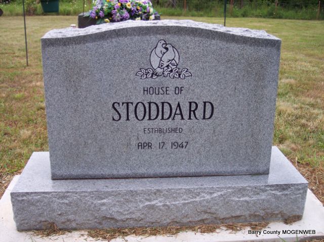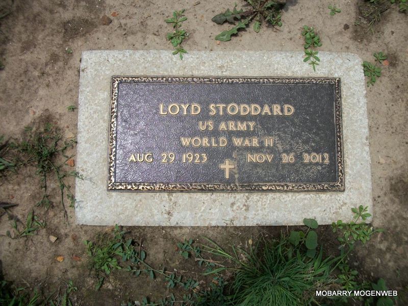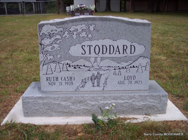 SSW: Ruth Ash - Research Note: He was the son of Ida Mae and Oliver Stoddard. Loyd graduated from Lamar High School and entered the army the following week. He served as surgical Technician in World War II. He later moved to Aurora where he lived for 66 years and retired from Juvenile Shoe Corp. after 40 years. Loyd married Ruth Ash on April 17, 1947 in the home of Rev. Stanley Miller in Marionville, MO. Loyd was preceded in death by his parents; two brothers, Buel Divine and Loren Stoddard; and one sister, Dorothy Brinkerhoff. He is survived by his wife, Ruth and many nieces and nephews who loved him. - Back of Stone - Inscription: "House of Stoddard established April 17, 1947" - Another Photo - Military Stone - Inscription: "US ARMY WORLD WAR II" | Peterson Funeral Home Phyllis Long Photos Diana Cope |