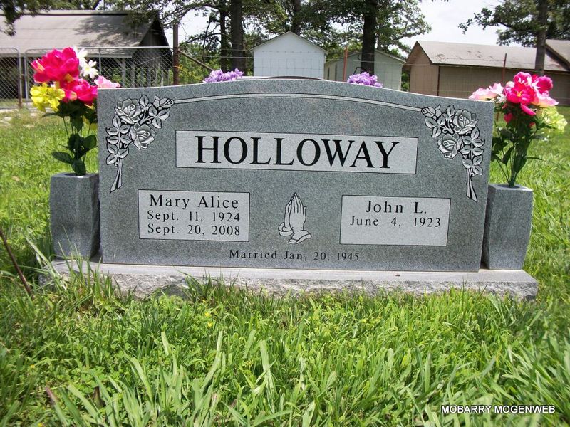 SSW: Mary Alice - Inscription: "Married Jan. 20, 1945" - Research Note: Purdy, MO resident. He was the son of Asa Parker and Cattie L. (Ash) Holloway. On January 20, 1945, in Siloam Springs, Arkansas, he was united in marriage to Mary Alice Collins, who preceded him in death on September 20, 2008. Also preceding him in death were his parents; three brothers, Bill, Earl and Walter Holloway and four sisters, Ethel Moore, Jesse Terry, Eunice Myers and Francis Haworth. John was a life-long resident of Barry County, receiving his education at McDowell. He was a self-employed over the road truck driver. | Fohn Funeral Home Phyllis Long Photo Diana Cope |