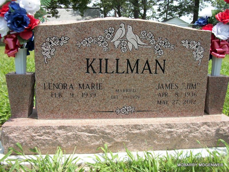 SSW: Lenora Marie - Inscription: "Married Dec. 19, 1959" - Research Note: He was the son of Louis Madison and Ella Mae (Powell) Killman. On December 19, 1959, in Butterfield, Missouri, he was united in marriage to Lenora Marie Terry. Preceding him in death were his parents; four sisters, Ruth Killman, Gladys Killman Mahurin, Elida Killman Moudy and Olena Killman Mattingly and four brothers, Chester Killman; Jim's twin brother, Stephen Killman; Oma Killman and Joseph Killman. Jim received his elementary education at Butterfield and graduated from Cassville High School. On June 8, 1955, he enlisted in the United States Navy, serving until June 12, 1959. For thirty-four years he was employed for Wells Aluminum, retiring as supervisor in shipping and packing. | Fohn Funeral Home Phyllis Long Photo Diana Cope |