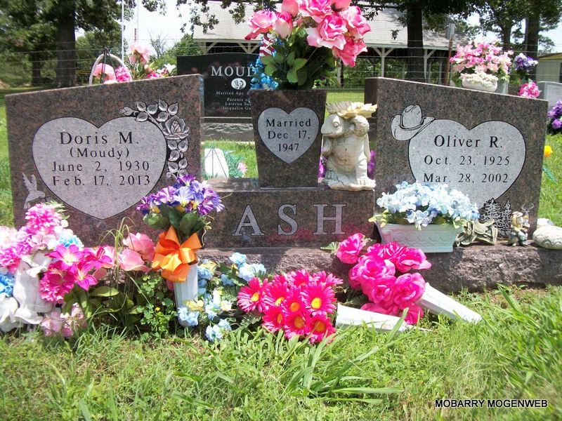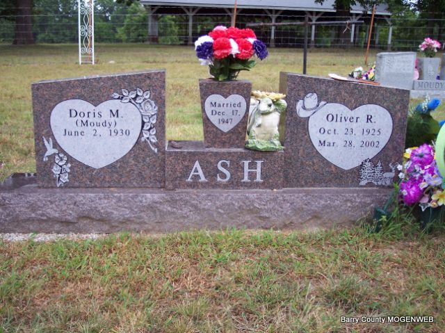 SSW: Oliver R. - Research Note: She was the daughter of Marion E. and Florence (Perkins) Moudy. On December 17, 1947, in Cassville, Missouri, she was united in marriage to Oliver R. Ash, who preceded her in death on March 28, 2002. Also preceding her in death were her parents; three brothers; one grandson and one great grandchild. Dorris grew up in the Butterfield Community and received her education at Butterfield and Purdy. She was a long-time member of Log Church at Butterfield. - Back of Stone - Another Photo | Fohn Funeral Home Phyllis Long Photos Diana Cope |