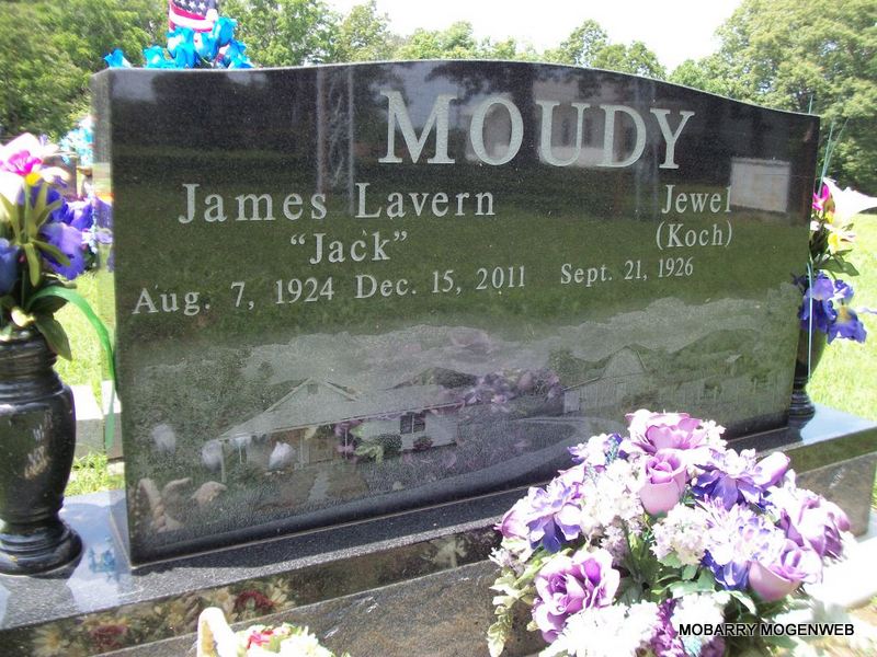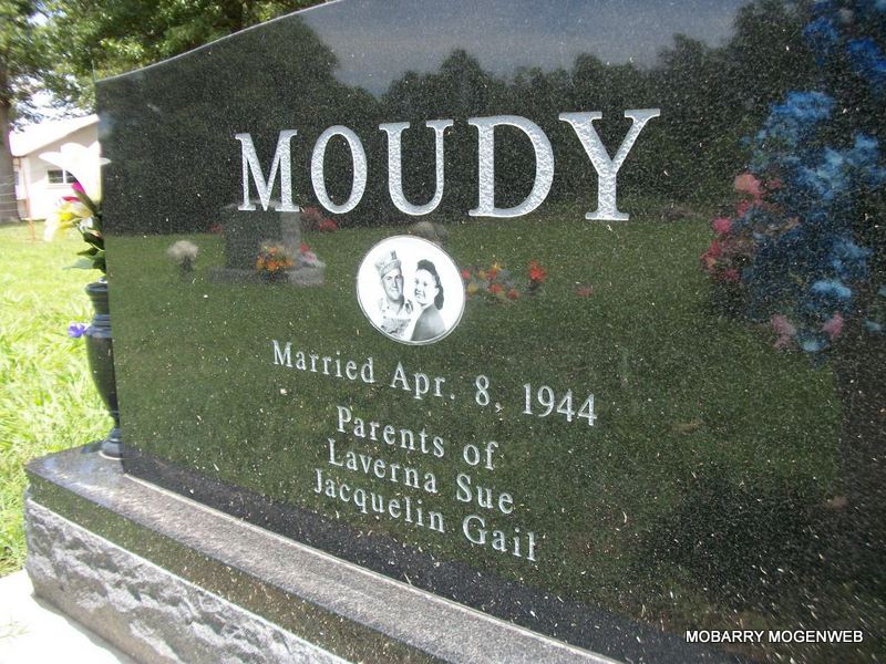 SSW: Jewel Koch - Inscription: "Married April 8, 1944" - Research Note: Son of Marion Earl Moudy and Florence Perkins. He retired from Springfield Paper Company as a truck driver. He was a U.S. Army veteran of World War II and a member of the Church of God in Eudora. - Back of Stone | Census Phyllis Long Photos Diana Cope |