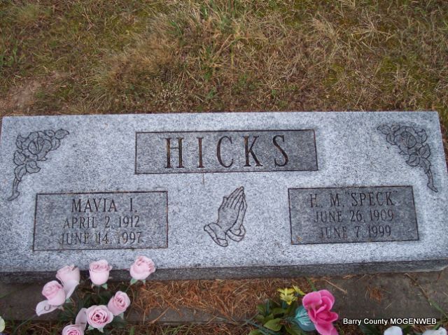 Research Note: He was a son of Francis Marion Hicks and Eddie Russia Kennedy. He was a retired pipe liner and cattle farmer. He moved to Butterfield in 1971 and moved to Carlsbad in 1998. Married Mavia Goacher, Oct. 30, 1963, in Oklahoma, she preceded him in death June 14, 1997. Father of Vera. - 1940 census, his wife was Violet Hicks, age 24, born OK. She was Violet Edith Barnes. | Cassville Democrat Mary Homesley Monett Times June 10, 1999 Census Phyllis Long Photo Diana Cope |