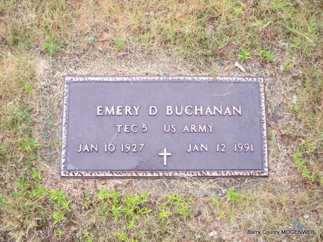 | BUCHANAN, Emery Darrell | Jan. 10, 1927 | Jan. 12, 1991 | SSW: Wilma Lee - Research Note: Son of Elva J. Buchanan and Bertha B. Nickle. - Back of Stone - Inscription: "Wed Feb. 23, 1945" - Military Stone -Inscription: "TEC 5 US ARMY" | Census Phyllis Long Headstone Mary Homesley Photos Diana Cope |