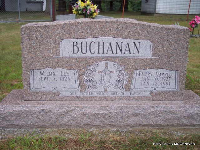 SSW: Emery Darrell - Research Note: She was the daughter of Roy and Lola (Brown) Bradley. On February 23, 1945, in Berryville, Arkansas, she was united in marriage to Darrell Buchanan, who preceded her in death on January 12, 1991. Also preceding her in death were her parents; one sister, Mary Tucker; mother and father-in-law, Elva and Bertha Buchanan and a nephew, Chuck Tucker. Wilma received her education in Butterfield and was a lifelong resident of Purdy. She worked at Jumping Jack's in Monett and Justin Boot retiring in 1980. - Back of Stone - Inscription: "Wed Feb. 23, 1945" | Fohn Funeral Home Phyllis Long Photos Diana Cope |