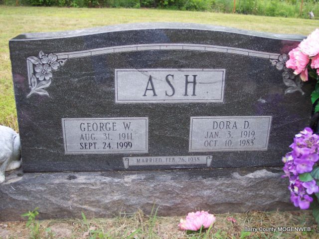 SSW: Dora D. - Inscription: "Married Feb. 26, 1938" - Research Note: He married Dora Terry on February 26, 1938, and she preceded him in death October 10, 1983. He married Edith (Williamson) Smith on October 6, 1984, in Cassville. The son of Marion and Monnie (Holloway) Ash. Survivors include one son, one daughter, one step-son, three step-daughters, four brothers, three sisters, three grandchildren, 10 step-grandchildren, five great grandchildren, and several step-great grandchildren. He was a farmer and construction carpenter, a member of the carpenter's union in Springfield, and a member of Oak Ridge Baptist Church in Cassville. | Monett Times Sept. 27, 1999 Mary Homesley Photo Diana Cope |