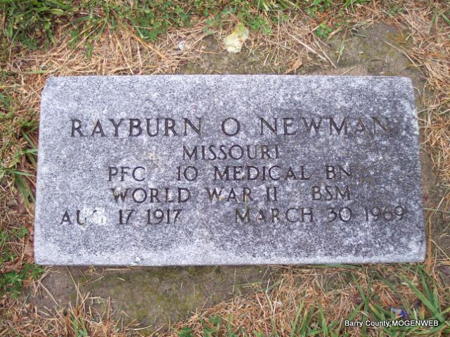 | NEWMAN, Rayburn O. | Aug. 17, 1917 | Mar. 30, 1969 | SSW: Opal - Inscription: "Married May 11, 1949" - Research Note: Son of Roy Chesley Newman and Edith Faye Garner. - Military Stone - Inscription: "MO PFC 10 MED BN WORLD WAR II BSN" | Census Phyllis Long Headstone Mary Homesley Photos Diana Cope |