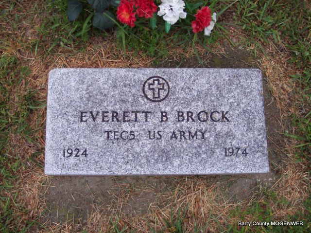| BROCK, Everett Blaine, Jr. | Nov. 23, 1924 | Dec. 1974 | Inscription: "TEC 5 US ARMY" - Research Note: Son of Everett Blaine Brock, Sr. and Ora Armilda Holman. | Census Phyllis Long Headstone Mary Homesley Photo Diana Cope |