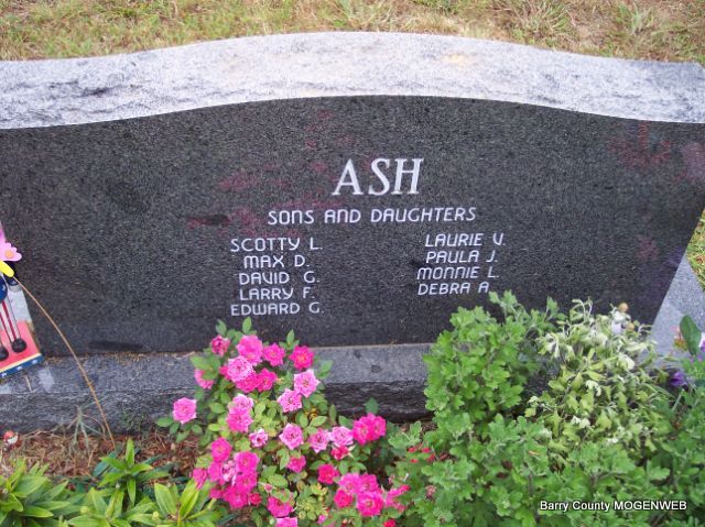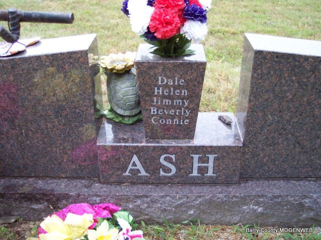 SSW: Doris M. - Inscription: "Married Dec. 17, 1947" - Research Note: He was the son of Marion D. and Monie (Holloway) Ash. He was a dairy farmer and an Army veteran of World War II. He married Doris Moudy on December 17, 1947, in Cassville. He was employed for 25 years with Jumping-Jacks Shoes in Monett, retiring in 1990. Survivors include two sons, three daughters, two brothers, two sisters, 14 grandchildren, 14 great grandchildren, and several step-great grandchildren. He was preceded in death by four brothers, Virgil Ash, Loren Ash, George Ash, and Hershall Ash; and five sisters, Willa Dean Ash, Marie Ash, Mary Bennett, Edna Hall, and Velma Kindrex. - Back of Stone - Military Stone - Inscription: "PFC US ARMY WORLD WAR II" - Another Photo | Monett Times April 1, 2002 Mary Homesley Photos Diana Cope |