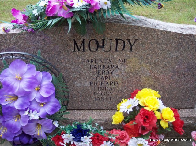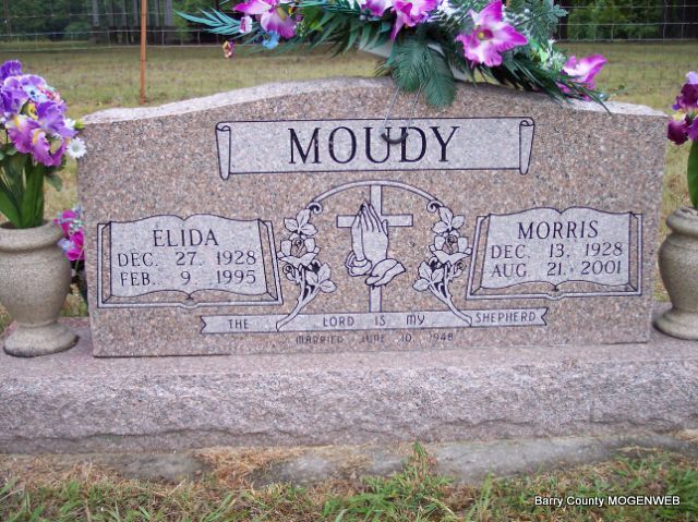 SSW: Elida - Inscription: "Married June 10, 1948" Research Note: Son of Marion Earl and Florence (Perkins) Moudy. He married Elida Killman on June 10, 1948, and she preceded him in death February 9, 1995. He married Lenora (Brandon) Langston on December 26, 1998. He moved to Purdy from Oklahoma as a child and later moved to Cassville. He was a carpenter and a member of New Life Temple in Cassville. Survivors include three sons, three daughters, three step-sons, one brother, three sisters, 16 grandchildren and 12 great grandchildren. He was preceded in death by one daughter, Barbara Moudy; one brother, Bud Moudy; and two grandchildren. - Back of Stone | Monett Times Aug. 23, 2001 Mary Homesley Photos Diana Cope |