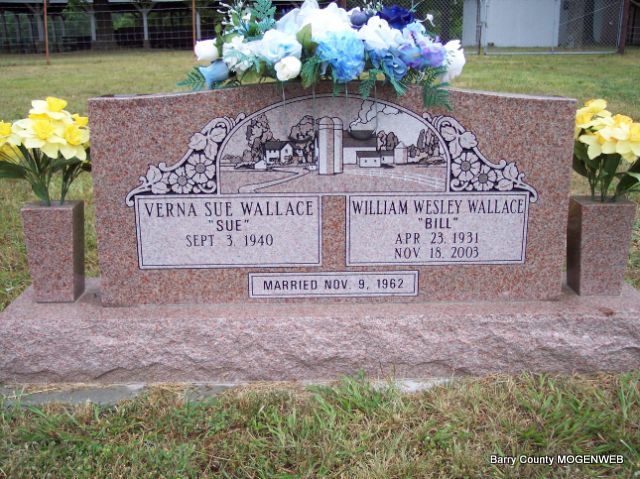 SSW: Verna Sue - Inscription: "Married Nov. 9, 1962" - Research Note: He was the son of Henry Wesley and Mary Emmaline (Foster) Wallace. He was an Army veteran of the Korean War. He was a retired farmer. He married Verna Sue Ash on November 9, 1962 in Butterfield. He was preceded in death by his parents; his brothers, Hugh Lee Wallace and Joe Wallace; and his sister, Lora Fowler. | Fohn Funeral Home Phyllis Long Headstone Sue Wallace Photo Diana Cope |