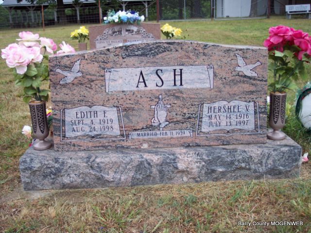 | ASH, Hershel Vernon | May 14, 1916 | July 13, 1997 | SSW: Edith F.-Inscription: "Married Feb. 11, 1939" - Research Note: He was the son of Marion D. and Monie (Holloway) Ash. | Brother's Obit Census Phyllis Long Headstone Mary Homesley Photo Diana Cope |