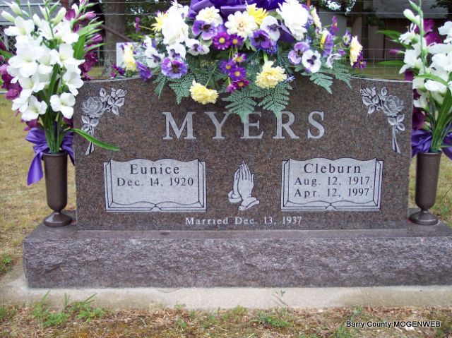 SSW: Cleburn - Inscription: "Married Dec. 13, 1937" - Research Note: She was the daughter of Asa Parker and Cattie (Ash) Holloway. She united in marriage to Cleburn Myers on December 13, 1937 in Purdy, Mo. He preceded her in death April 12, 1997. Eunice was preceded in death by three brothers: Bill, Walter and Earl and three sisters: Ethel, Jessie and Frances. Back of Stone - Another Photo | Bennett-Wormington Phyllis Long Photos Diana Cope |