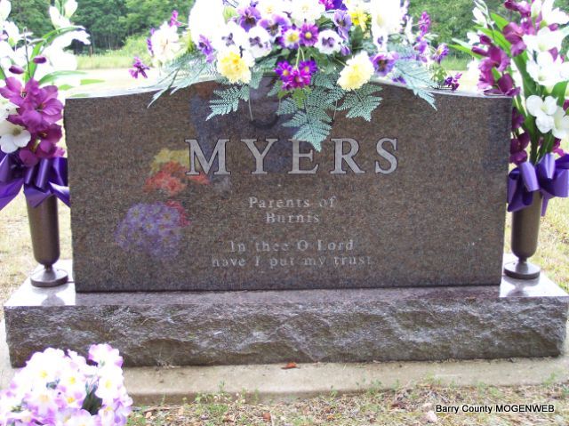 | MYERS, Troy Samuel | Nov. 27, 1908 | Feb. 25, 1998 | SSW: Julie Mae Myers - Research Note: Son of John Blaine Myers and Bertha Zoretta Cook. | Census Phyllis Long Headstone Mary Homesley Photo Diana Cope |
