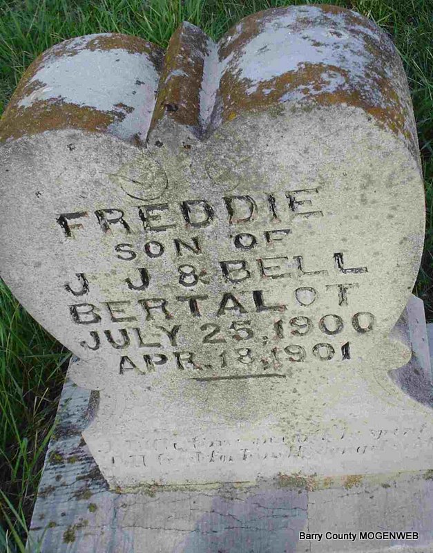| BERTALOT, Freddie | July 25, 1900 | Apr. 18, 1901 | Inscription: "Son of J. J. and Bell Bertalot" | Photo Donna Cooper |