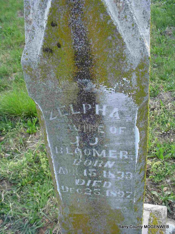 | BLOOMER, Zelphia | Apr. 15, 1833 | Dec. 25, 1897 | Inscription: "Wife of J. J. Bloomer" - Research Note: Zelphia Thompson married John J. Bloomer on Feb. 8, 1860 in Pulaski Co., KY. John died in KY. | KY Marriage Records Phyllis Long Photo Donna Cooper |