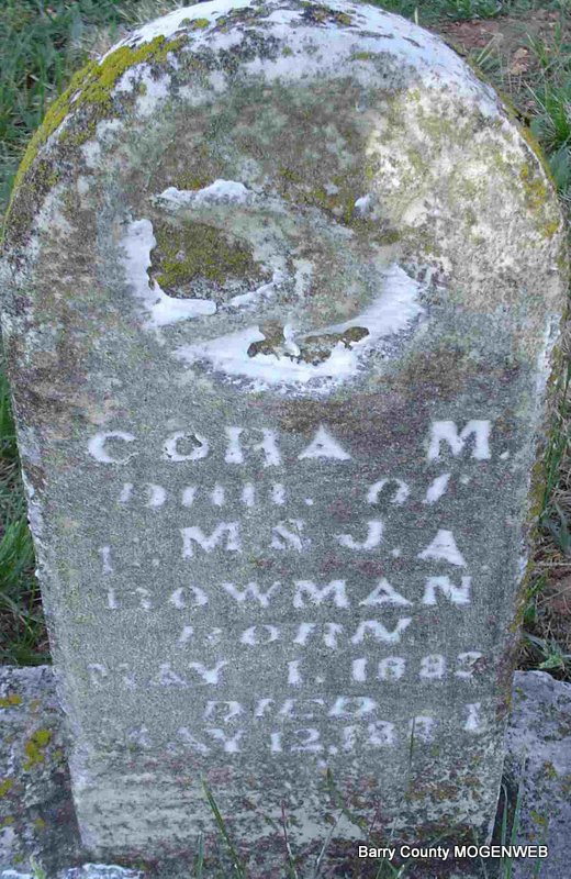 Research Note: Husband of Johanna (Neal) Bowman. Son of Josiah Bowman and Fanny Dillard. - Cassville Republican, July 7, 1892 - Our thanks are due Elijah Bowman, of south of town, for some excellent raspberries and some dewberries, which he kindly presented us Tuesday. Mr. Bowman can give many small fruit growers pointers on the planting and care of small fruit. He has some of the finest strawberries that we saw this year, as well as raspberries. - May 2, 1908, Saturday, Cassville Democrat - Judge E. M. Bowman Dead - A well spent life was closed and the book of accounts, so far as this life is concerned, closed with it, and Judge Elijah M. Bowman's spirit went to Him, who gave it from his home in McDonald township. Tuesday morning, April 24th, 1908, of a cancer, aged 64 years, surrounded by a loving wife, sons and daughters. The Judge Bowman, we believe, was born in Tennessee, and came to Barry County many years ago and located in Capps Creek township, where he resided until he moved to his late home. In 1902, he was elected County Judge from the Western District, on the Democratic ticket, and served his people well. He leaves a wife, four sons and two daughters to mourn his death. They are Joseph, of Miller, MO; John, Albert, and Claiborn and Miss Leta and Mrs. Ollie Ash of McDonald Township. Judge Bowman was a member of the Fairview Baptist church, 8 miles out on the Springfield road. The remains were laid to rest Tuesday evening in the Maddy Cemetery west of Purdy. Another good citizen is gone to his reward - a family is broken and his neighbors will miss him. The family have our sympathies. | Online Newspapers Census Phyllis Long Photo Donna Cooper |