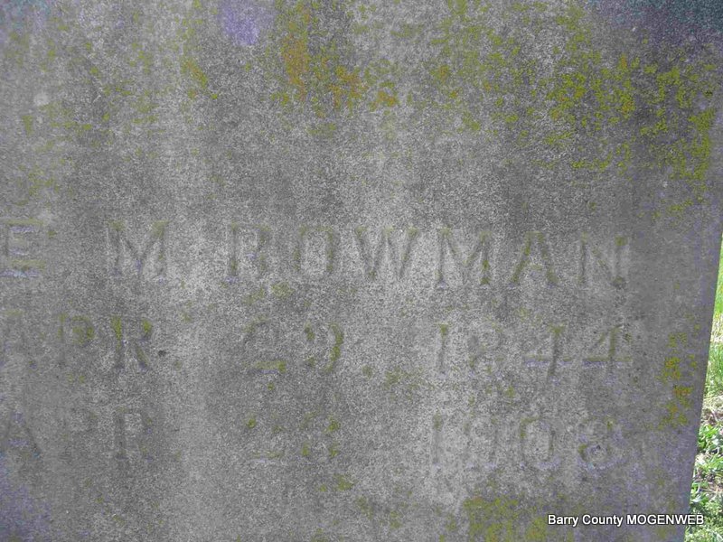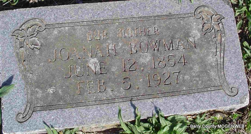 Inscription: "Our Mother" - Research Note: Wife of Elijah Marion Bowman, he is also buried at Maddy. They have separate stones. Johanna's mother, Elizabeth Alice Montgomery, is buried there and probably her step-father, Joseph Shepherd also. Callaway Funeral Home Records: Johanna Bowman, funeral Feb. 7, 1927, place of death Monett, MO., services at the funeral home at 2:30 PM. - Death date not given, age 72 yrs, 7 mos., 22 dys., buried Madry/Maddy Cemetery, born June 12, 1854, Gordon, GA. Adam Neal, her father, was born in Ireland and her mother Alsey, aka Elizabeth Alice Montgomery, born GA. Joe C. Bowman, Miller, MO was the informant on the death certificate. - Cassville Democrat, Saturday, July 10, 1920 - Mrs. E. M. Bowman of Miller, Lawrence County, came Wednesday and was met here by her son John Bowman of near Viola, where she went Thursday to visit her son and family. | Death Certificate Online Newspapers Phyllis Long Callaway Funeral Home Photo Donna Cooper |