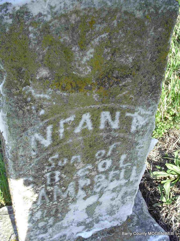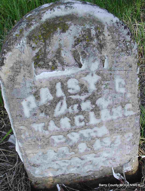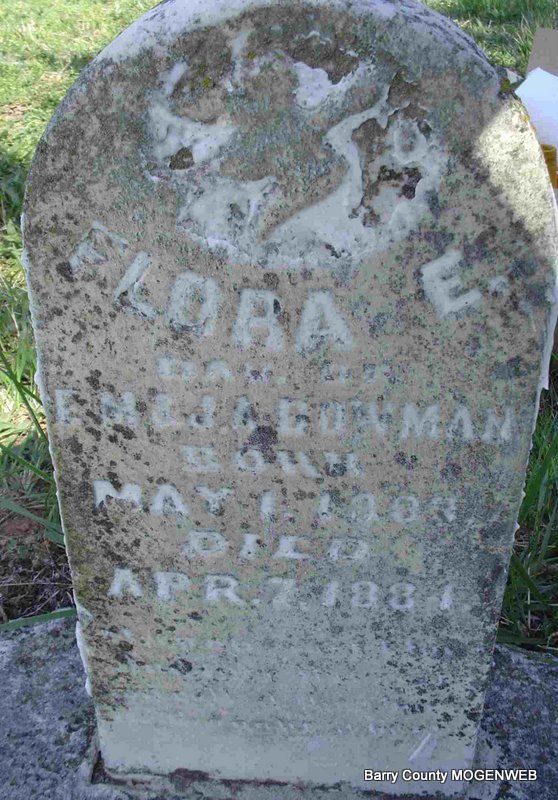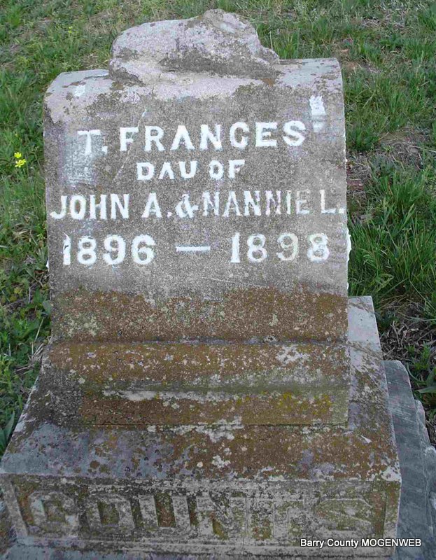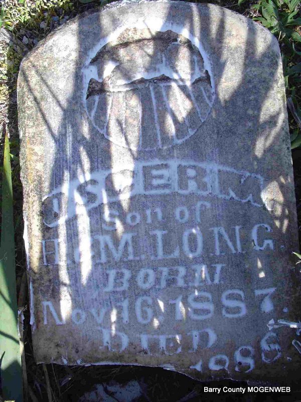 | LONG, Daisy C. | Mar. 9, 1879 | Mar. 20, 1879 | Inscription: "Daughter of G. W. and S. C. Long" - Research Note: George W. Long married Susan C. Trentham on Feb. 24, 1876 in Barry Co., MO. | MO Marriage Records Phyllis Long Photo Donna Cooper |