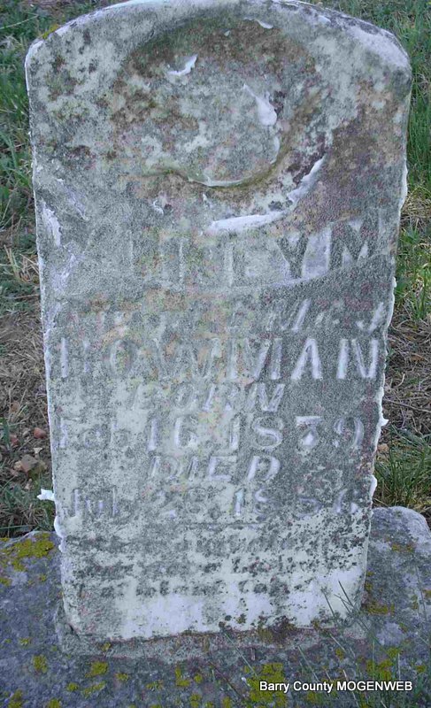 | CAMPBELL, Mary V. (NEAL) | Apr. 5, 1848 | July 29, 1888 | Inscription: "Wife of George Campbell" - Research Note: Daughter of Adam Neal and Alsey Elizabeth Montgomery. George W. Campbell married Mary Vasti Neal in 1866. George W. Campbell, age 44, second married Lottie Kay, age 22, on Nov. 29, 1891 in Barry Co., MO. - 1880 Census, Shoal Creek Twp., Barry Co., MO - George Campbell, Self, Married, Male, White, 30, GA, Farmer, TN, GA; Mary V. Campbell, Wife, Married, Female, White, 32, GA, Keeping House, GA, GA; Amanda E. Campbell, Dau, S, Female, White, 13, GA, At Home, GA, GA; Robert L. Campbell, Son, S, Male, White, 10, GA, At Home, GA, GA; John A. Campbell, Son, S, Male, White, 8, GA, GA, GA; Georgia F. Campbell, Dau, S, Female, White, 6, GA, GA, GA; Julia O. Campbell, Dau, S, Female, White, 4, GA, GA, GA; William L. Campbell, Son, S, Male, White, 1, MO, GA, GA | Census MO Marriage Records Int'l Marriage Records Phyllis Long Photo Donna Cooper |