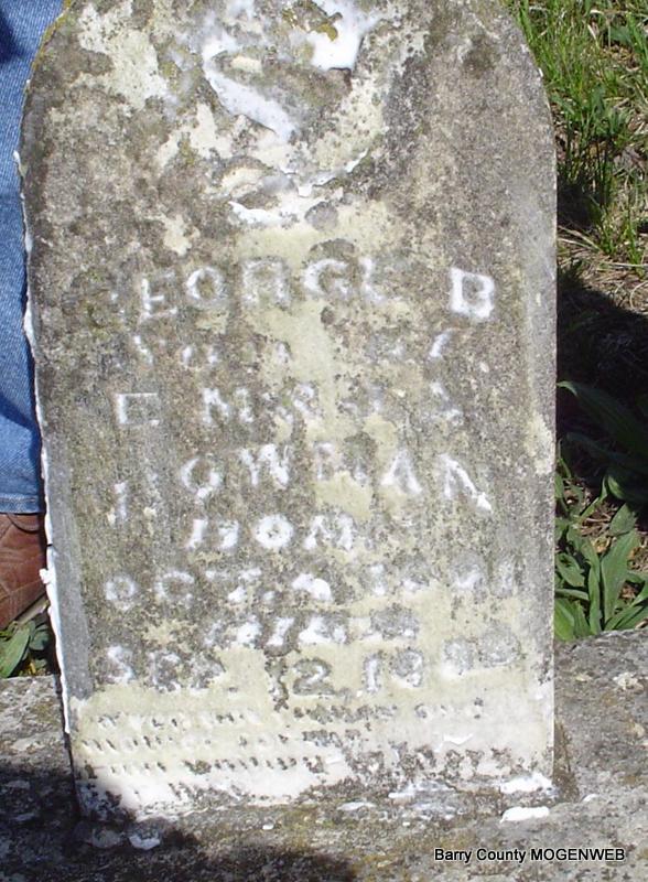 | BOWMAN, George B. | Oct. 4, 1881 | Sept. 12, 1882 | Inscription: "Son of E. M. and J. A. Bowman" - Research Note: Daughter of Elijah Marion Bowman and Johanna Neal. | Note Phyllis Long Photo Donna Cooper |