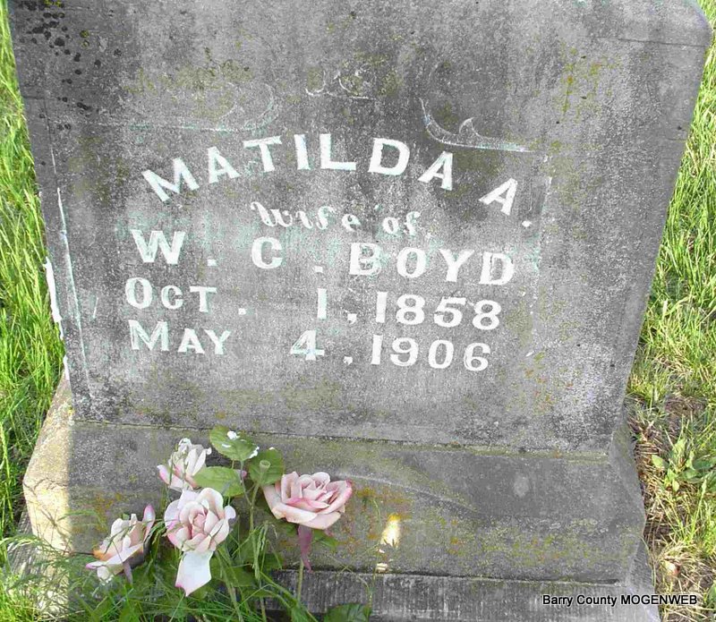 | BOYD, Matilda Ann (DRAKE) | Oct. 1, 1858 | May 4, 1906 | Inscription: "Wife of W. C. Boyd" - Research Note: Wife of William Coleman Boyd. Daughter of Jacob Drake and Margaret Elina Counts. | Census Int'l Marriage Records Phyllis Long Photo Donna Cooper |