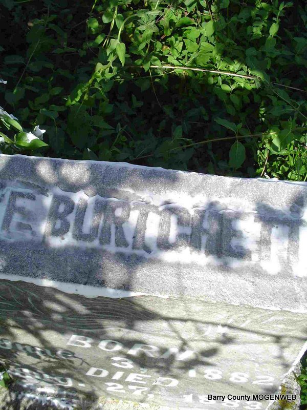 | BURCHETT, U. F. | June 3, 1882 | July 27, 1883 | Research Note: Name was Ulysses F. Burchett and he was a son of Hiram Emerson and Serilda Jane (Long) Burchett. He was a grandson of Simon Hiram and Tabitha (James) Long. Top of stone has the inscription of U. F. Burchett. - Another Photo | Note Photos Donna Cooper |