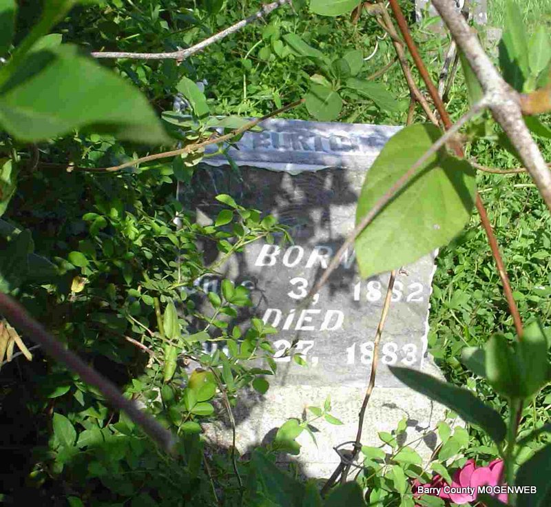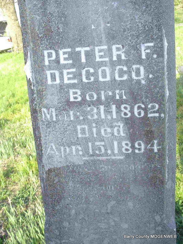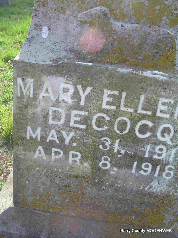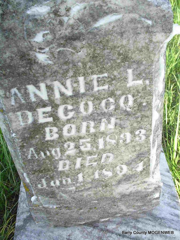 | DECOCQ, Annie L. | Aug. 25, 1893 | Jan. 1, 1894 | Research Note: Daughter of Leopold Joseph DeCocq and Amelia Mutrux. - Cassville Republican, Barry Co., MO, Thursday, Jan. 4, 1894 - Paul Decocq, of near Purdy, lost a baby, 4 months old, Sunday. | Headstone Roberta DeCocq Online Newspapers Phyllis Long Photo Donna Cooper |