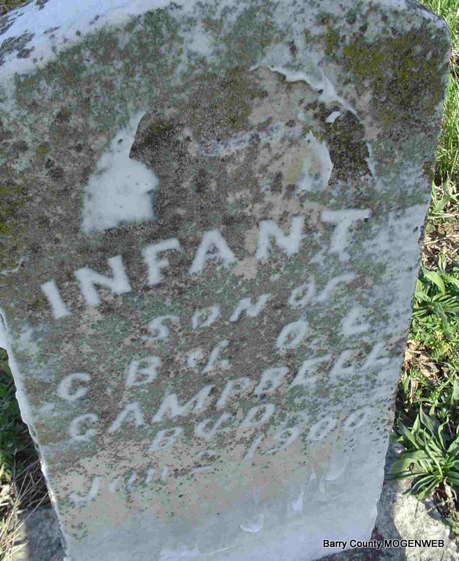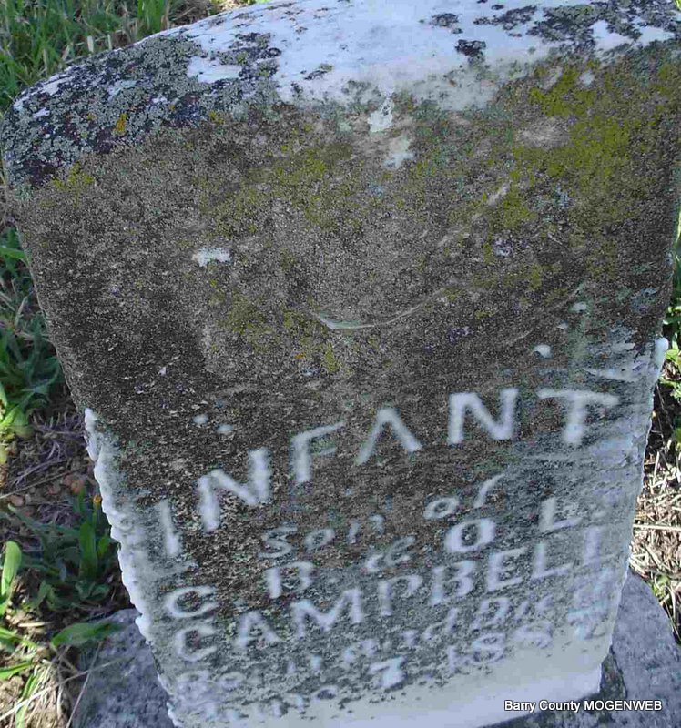 | CAMPBELL Infant | June 7, 1887 | June 7, 1887 | Inscription: "Son of C. B. and O. L." - Research Note: Columbus Boyd and Ona Lucinda (Ferguson) Campbell. - Another Photo | Headstone Candie Campbell Wollard Photos Donna Cooper |