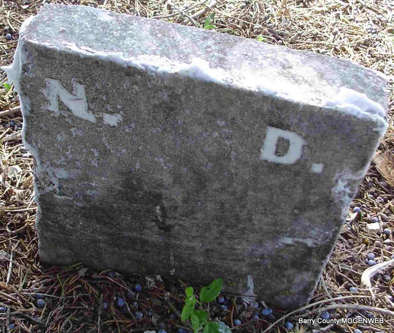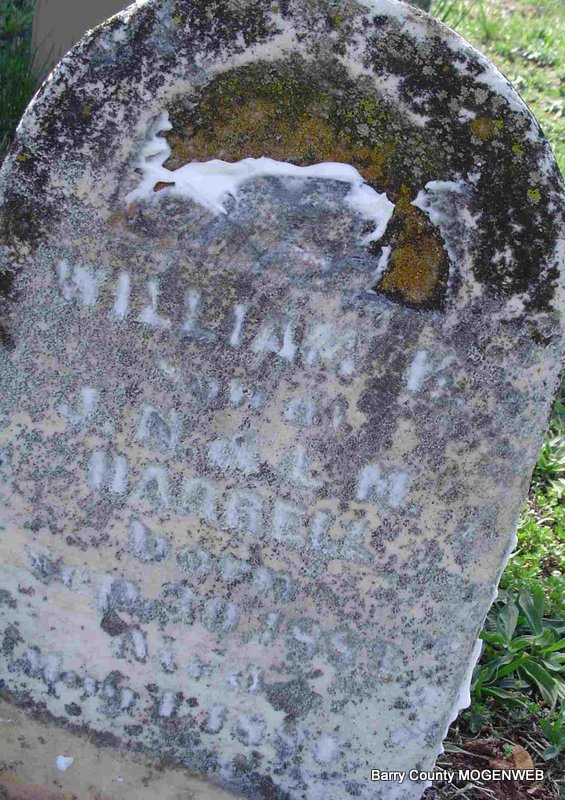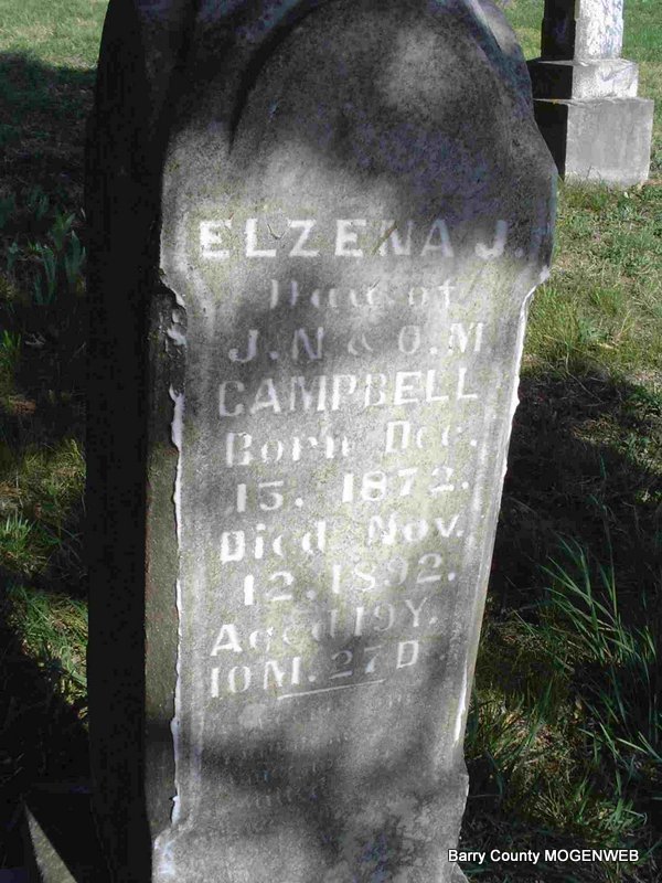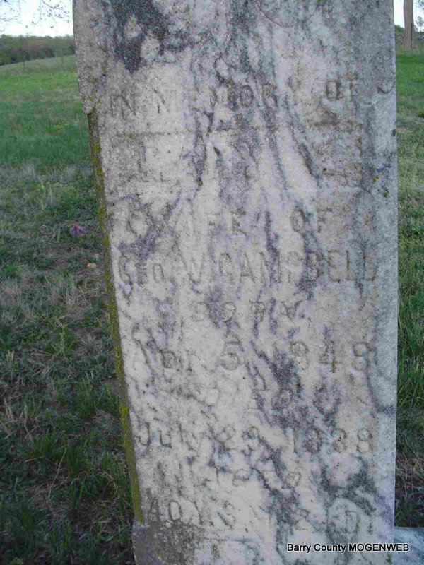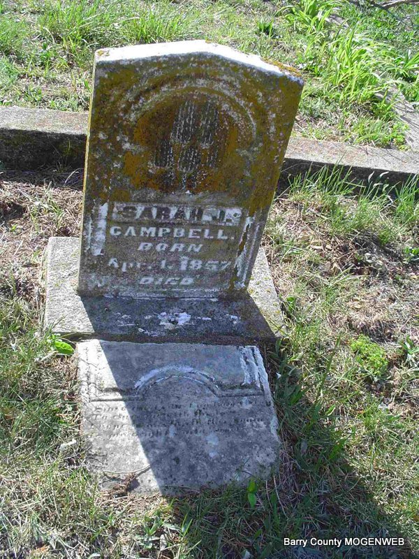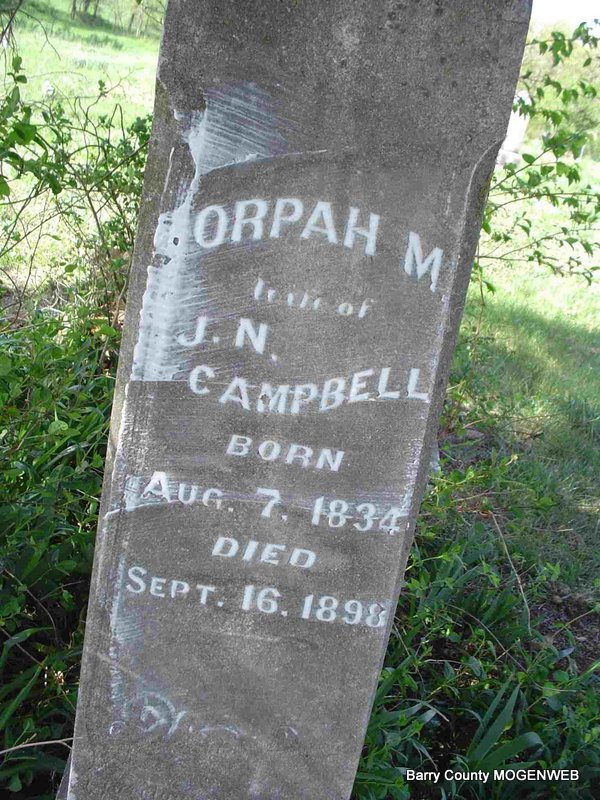 | CAMPBELL, Orpha M. (DOUGLASS) | Aug. 7, 1834 | Sept. 16, 1898 | Inscription: "Wife of J. N. Campbell" - Research Note: Thought to be the daughter of Madison Martin Douglass and Sarah Bonham. - Goodspeed's History - John Newman Campbell, a farmer and stock raiser of Barry Co., MO, was born in Monroe Co., TN on July 4, 1832. He is a son of Reuben and Polly (Dillard) Campbell. Reuben Campbell was a farmer, and was born in SC. When a young man he emigrated from his native state of TN, where he was married. He and wife were the parents of ten children, eight of whom are living. John N. Campbell is their second child. When a boy he went with his parents to GA, in which state he remained until the Civil War. There he married Orpha Douglass, a native of GA, born in Aug. 1835, and to them have been born ten children, all of whom are living; their names are Albert, Columbus, Elijah, Gerome, Louisa, Madison, William, John, Elzena and Oscar. Mr. Campbell removed his family from GA to IN, and five years later immigrated to AR. Remaining in the latter state about 7 years, they removed to MO, locating in Barry Co. He has reared a large family of intelligent children, and has a good farm of about 100 acres. The family are members of the Cumberland Presbyterian Church. In politics Mr. Campbell endorses and supports the principles of the Democratic party. - 1880 Census, Shoal Creek Twp., Barry Co., MO - John N. Campbell, Married, Male, White, 47, TN, Farmer, TN, TN; Orpah Campbell, Wife, Married, Female, White, 44, TN, Keeping House, TN, TN; Columbus B. Campbell, Son, S, Male, White, 22, GA, Farmer, TN, TN; Elijah W. Campbell, Son, S, Male, White, 21, GA, Farmer, TN, TN; Stephen J. Campbell, Son, S, Male, White, 19, GA, At Home, TN, TN; Sarah C. Campbell, Dau, S, Female, White, 16, GA, At Home, TN, TN; Madison B. Campbell, Son, S, Male, White, 13, IN, At Home, TN, TN; William A. Campbell, Son, S, Male, White, 11, IN, At Home, TN, TN; John M. Campbell, Son, S, Male, White, 9, AR, TN, TN; Elzenah J. Campbell, Dau, S, Female, White, 6, AR, TN, TN; Oscar N. Campbell, Son, S, Male, White, 3, MO, TN, TN | Census Goodspeed Phyllis Long Photo Donna Cooper |