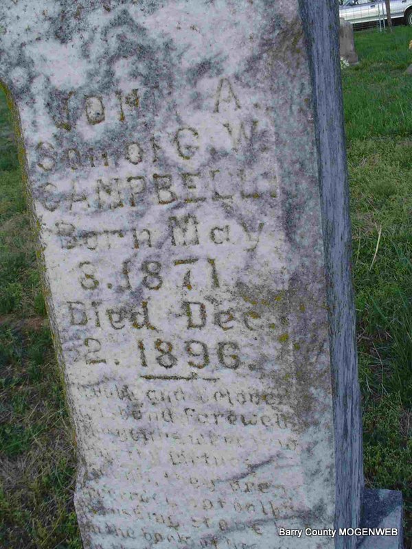 Inscription: "Son of G. W. Campbell" - Research Note: Son of George Campbell and Mary V. Neal. John A. Campbell, age 28, married Florence Waltrick, age 18, on Aug. 22, 1895 in Barry Co., MO. | Census MO Marriage Records Phyllis Long Photo Donna Cooper |