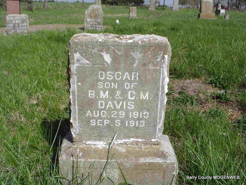 | DAVIS, Oscar | Aug. 29, 1913 | Sept. 5, 1913 | Inscription: "Son of B. M. and G. M. Davis" | Photo Donna Cooper |
