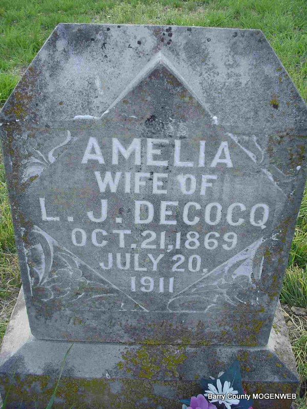 Inscription: "Wife of L. J. DeCocq" - Research Note: Amelie Mutrux married Leopold DeCocq on Dec. 25, 1890 in Stone's Prairie, Barry Co., Mo. Researcher's say she was the daughter of Lucien Mutrux and Elise Compeche. Son Pierre Leopold DeCocq's death certificate gives his mother's maiden name and place of birth. Pierre is buried at Mt. Pleasant Cemetery. | Headstone Roberta DeCocq Note MO Marriage Records Phyllis Long Photo Donna Cooper |
