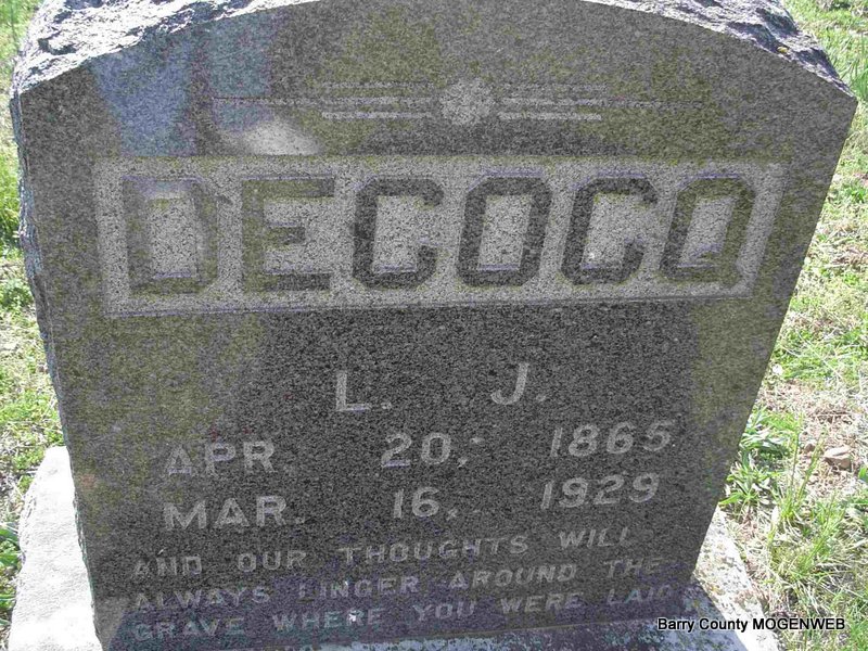 Research Note: First wife was Amelia. Leopold DeCocq married Amelia Mutrux on Dec. 25, 1890 in Barry Co., MO. His wife at the time of death was Stella. Leopold J. DeCocq, age 47, married Stella Trent, age 35, on Aug. 7, 1912 in Barry Co., MO. Accidental drowning was the cause of death. Son of Benjamin DeCocq and Desiree Blaine, both born France. P. L. (Pierre Leopold, son) DeCocq of Purdy, MO was the informant on the death certificate. - Wheaton Journal, Mar. 21, 1929 - Farmer Drowns in Water Tank: Leopold J. Decocq, a farmer who lived a mile south of Corsicana, was found drowned in a watering tank early Saturday morning, by his wife and son. The coroner, Floyd Callaway was called but after he had made an investigation, he decided that the man had died from natural causes and a coroner's inquest was unnecessary. Decocq, who was about 64 years old, had been complaining of not feeling well for several days. He is believed to have become dizzy and fallen in the tank. Mr. Decocq went to the barns just about daybreak to feed the stock. He was carrying a lantern. Between the two barns is a big watering tank. Instead of going a longer way and opening a gate to get from one barn to the other, Mr. Decocq had been in a habit of walking the edge of the tank. He is supposed to have become dizzy, lost his balance, and fallen in the tank. He had been there only twenty or thirty minutes when he was found, for his wife and son started to find him when he did not come to the house as promptly as they expected. Leopold J. Decocq was born April 19 (should be 20), 1865 in France, came with his parents to the United States in 1875 and departed this life March 16, 1929 at the age of 63 years, 10 months and 26 days. He was united in marriage Dec. 25, 1890 to Amelia Lucie Mutrux. To this union eight children were born, four of whom are living: Pierre L. and Henry A. of Purdy, Mo. (should be south of Corsicana, Mo.), Mrs. Emma Whipple and Louie G. of Forest City, Mo. His wife preceded him in death July 15 (should be 20), 1911. August 7, 1912 he was united in marriage to Stella F. Trent. To this union five children were born, four of them living: Eunice Leah, William Lafay, Flora Fay, and Tressa Elizabeth, all at home. Besides his wife and children he is survived by the following brothers and sisters: Adolph of Rosedale, Ark., Ben H. and Lewis of Little River, Kan., Mrs. Mary Sass, Purdy, Mo., Mrs. Anna Mutrux, Exeter, Mo., and Mrs. Ernest Planchon of Monett, Mo. He also leaves seven grandchildren and other relatives and friends to mourn his departure. He professed his religion early in life and has since lived a devoted life to his family and to his Lord. Funeral services were conducted Monday afternoon March 18 by Rev. Eddie Freeman at the Mt. Joy Church. Internment was made in the Maddy Cemetery under the direction of Pogue's Undertaking, Wheaton. - DeCocq Family Reunion Photo | Death Certificate Online Obit MO Marriage Records Phyllis Long Photo Donna Cooper |