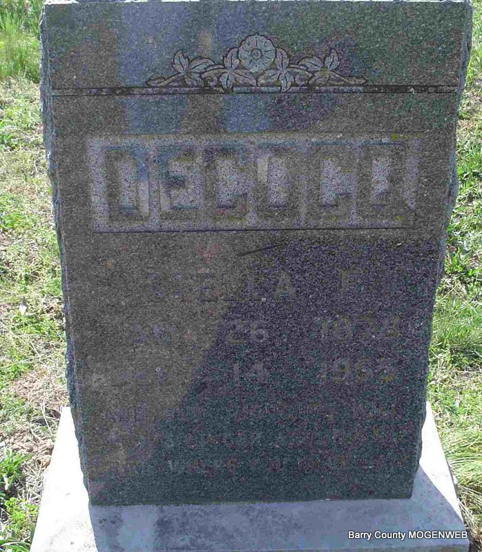 Research Note: Second wife of Leopold Joseph DeCocq. - Widowed at the time of death. Daughter of Jess Trent and Anna Roe. Tressa Lenord of Purdy, MO was the informant on the death certificate. - Leopold J. DeCocq, age 47, married Stella Trent, age 35, on Aug. 7, 1912 in Barry Co., MO. - Joplin Globe, December 15, 1955 - PURDY, Mo., Dec. 14 - Mrs. Stella F. DeCocq, 77 years old, a resident of the Corsicana community the last 43 years, died at 3 o'clock Wednesday morning at her home near Purdy. Although she had been in ill health for a year, the death was unexpected because of recent improvement in her health. She was a member of the Holiness church. Survivors include a son, Lafay Decoq of rural Purdy; three daughters, Mrs. Fay Harrell and Mrs. Tressia Leonard of Purdy and Mrs. Eunice Cole of Granby; three step-children, Louie and Henry Decoq of near Wheaton and Mrs. Emma Whipple of Midland City, Mo. The body was received by the McQueen funeral home of Wheaton and will lie in state there until this afternoon when it will be removed to the home near Purdy. It will remain there until just before the funeral hour. The funeral will be at 2 o'clock Friday in the Culver Chapel in Cassville. Burial will be in Maddy cemetery near Purdy. | Note Roberta DeCocq Death Certificate Online Obit Phyllis Long Photo Donna Cooper |