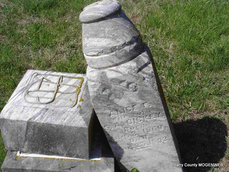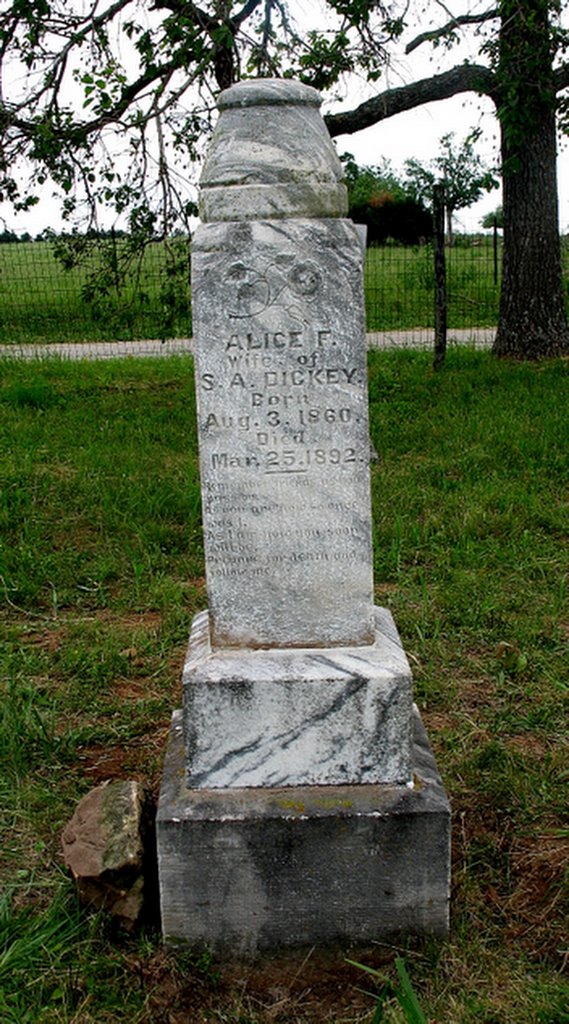 | DICKEY, Alice Faneta (PAMPLIN) | Aug. 3, 1860 | Mar. 25, 1892 | Inscription: "Wife of S. A. Dickey" - Research Note: The Cemetery Restoration Committee of the BCG and HS reset this stone May 2007. Alice F. Pamplin married Samuel A. Dickey on Aug. 16, 1877 in Lincoln Co., TN. Researchers say she was the daughter of Joel K. Pamplin and Cynthia Elizabeth Yant. - Another Photo | Census TN Marriage Records Phyllis Long Photo Donna Cooper Photo Jack Fly |
