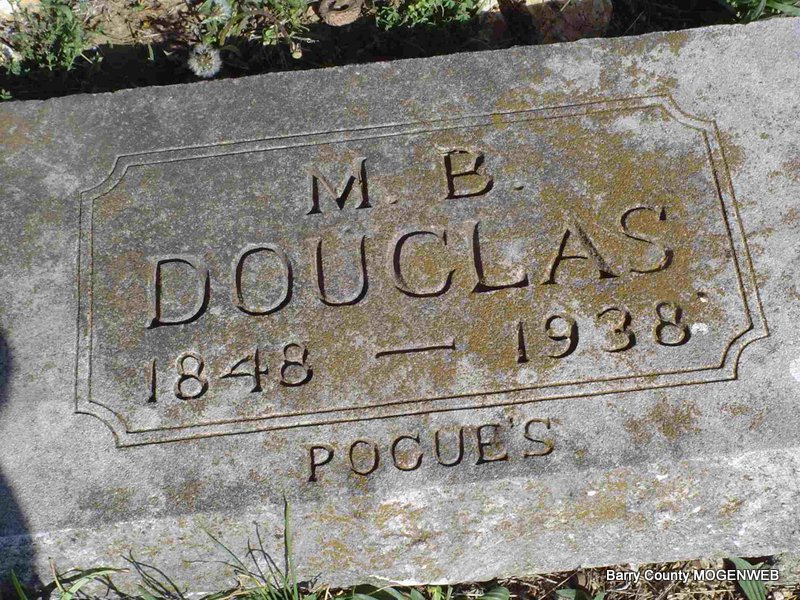 Research Note: His wife was Mary Alice Douglass. Son of M. M. Douglass born GA. Mother not named on the death certificate. Liver cancer was the cause of death. Mary A. Douglass of Wheaton, Barry Co., MO was the informant. - Son of Madison Martin Douglass and Sarah Bonham. He first married Mary Adaline Waltrip. Second married Mary Alice Stinnett. Madison B. Douglas married Alice Stinnett on June 13, 1901 in Barry Co., MO. Mary was the daughter of John R. Stinnett and Martha E. Walters, born IL. Born 1866 in Purdy, MO and died 1946 in Wheaton, MO. Buried at Purdy Cemetery. | Death Certificates MO Marriage Records Census Phyllis Long Photo Donna Cooper |